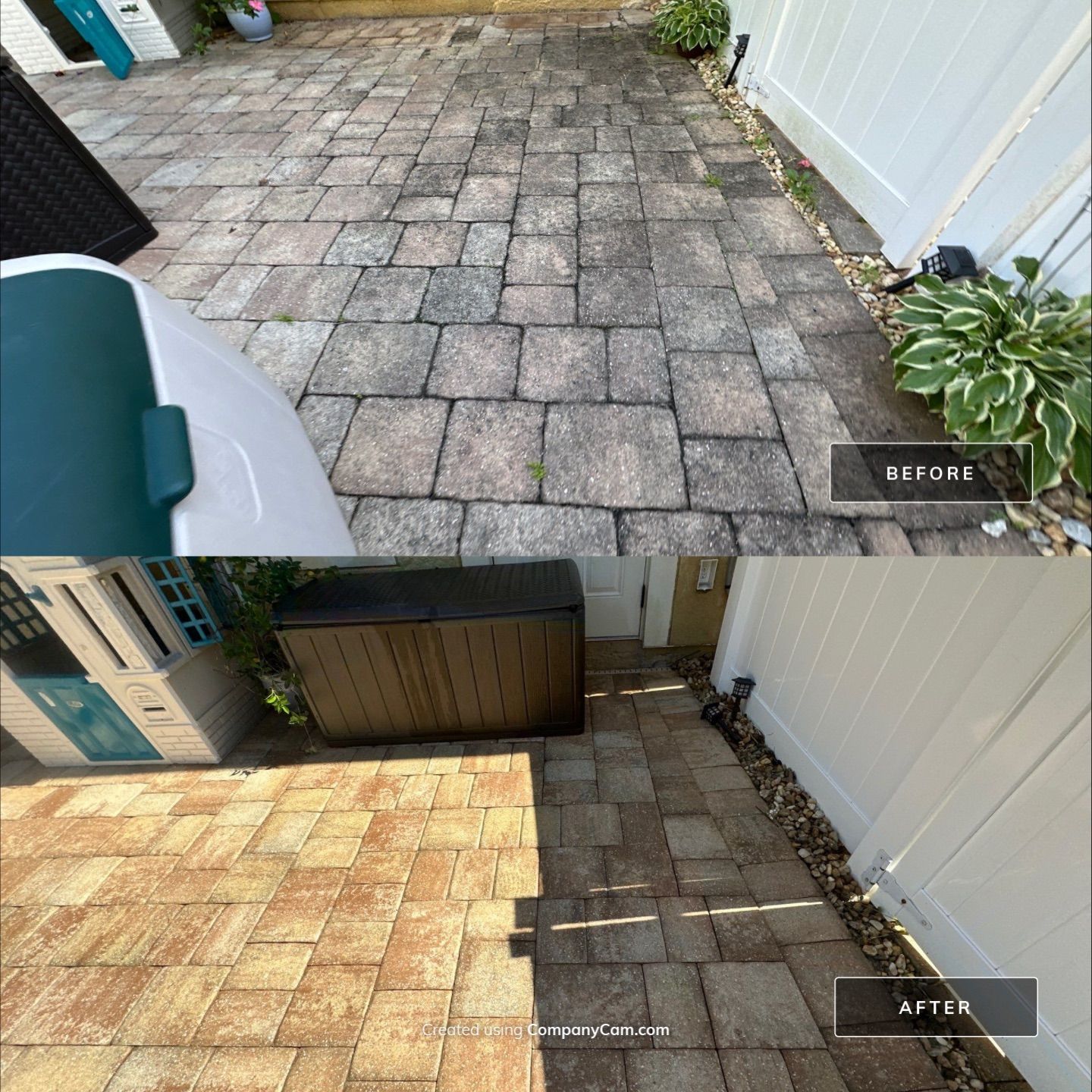 After: Restored natural color, brightened pavers, clear screens, and improved surface safety